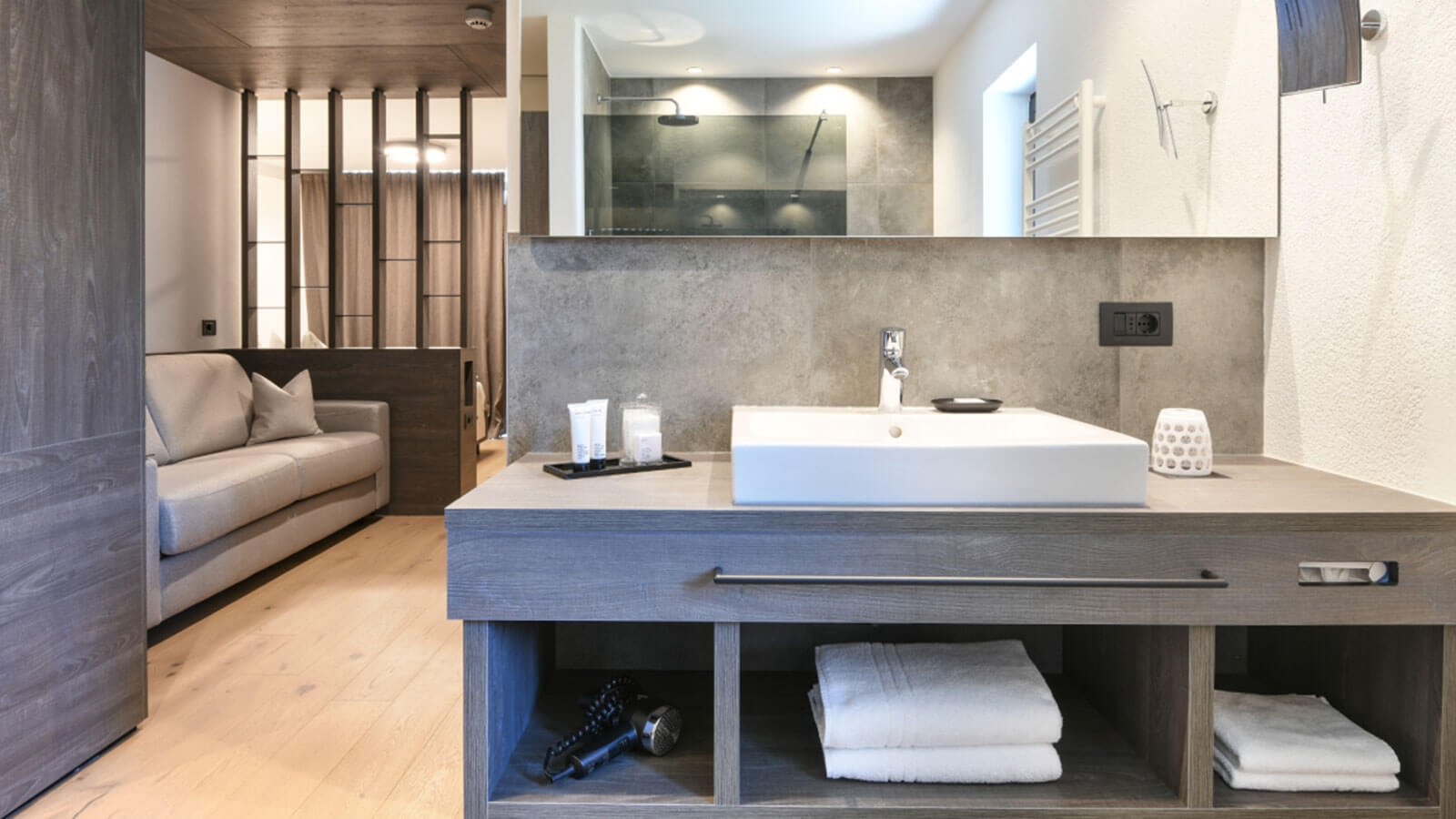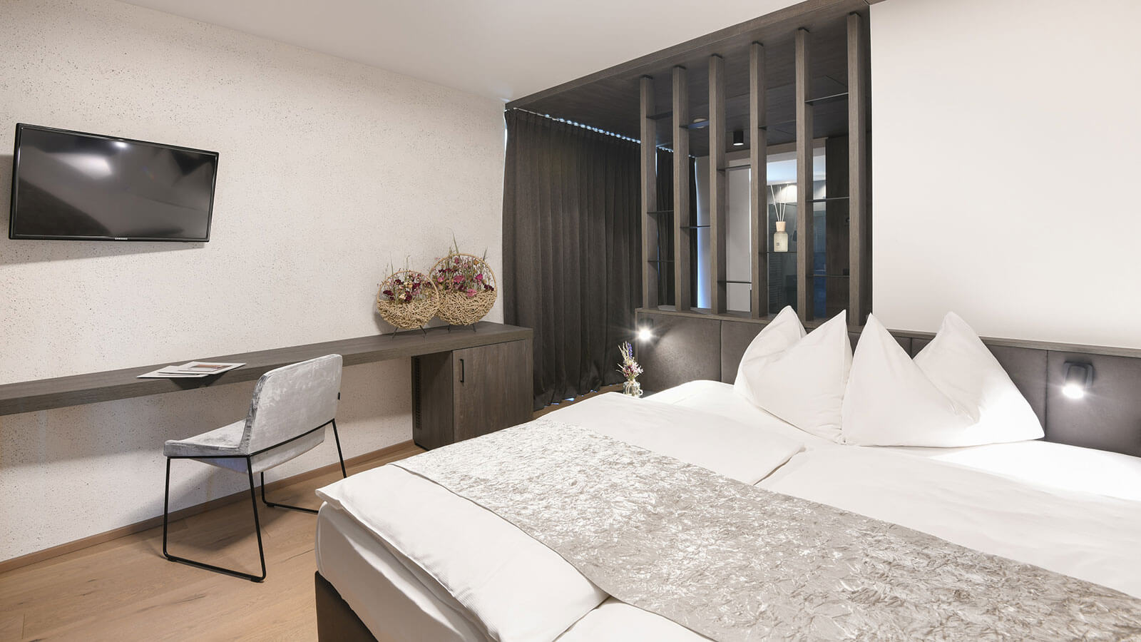 In our new Lifestyle Suite you can really relax at the end of a day out in the fresh and pure mountain air. Just think of the comfortable reading corner to enjoy the cold days, and of the large, soft sofa with audio system to spend a pleasant evening “just in two”. The entire room is furnished in “black & white” and has a south-facing balcony.